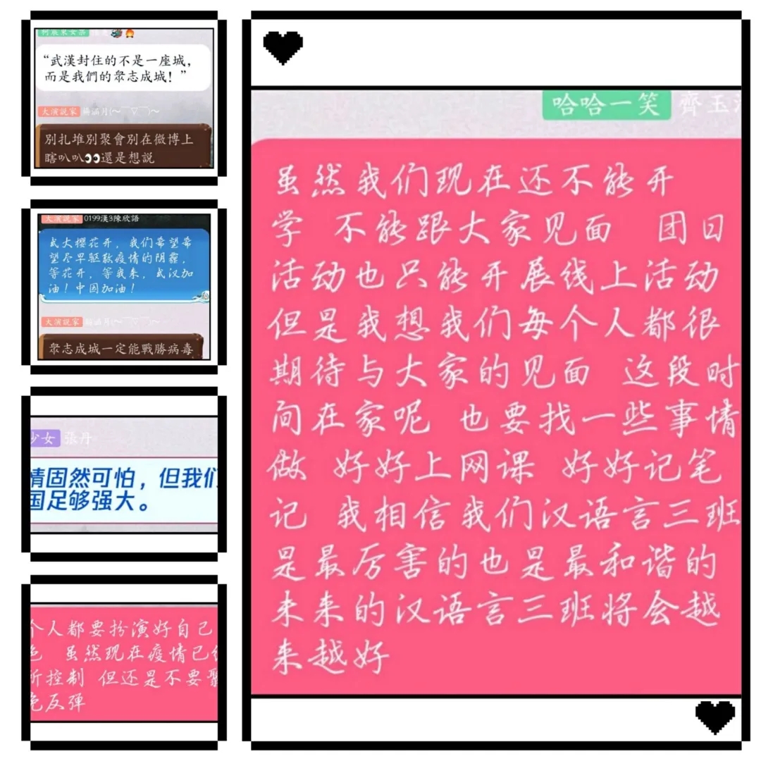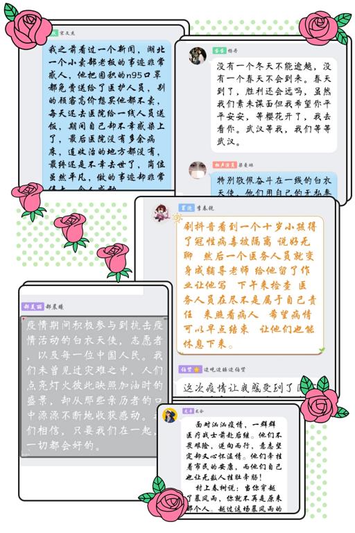活动期间,共有34个团支部、940余名团员紧密围绕主题积极参与其中,运用多种方式为抗“疫”贡献力量。百余名团员极投身家乡线上、线下的志愿服务工作,以实际行动参与疫情防控阻击战,并分享自己的志愿服务故事;各团支部通过举办防疫知识竞赛、拍摄抗疫暖心视频、手写抗疫祝福卡片等形式致敬一线工作人员;通过开展“晚安湖北”短信计划、“云打卡”计划、“城南花已开”曲目改编、“疫情在行动·文字表深情”等活动抒发团员青年的心声。