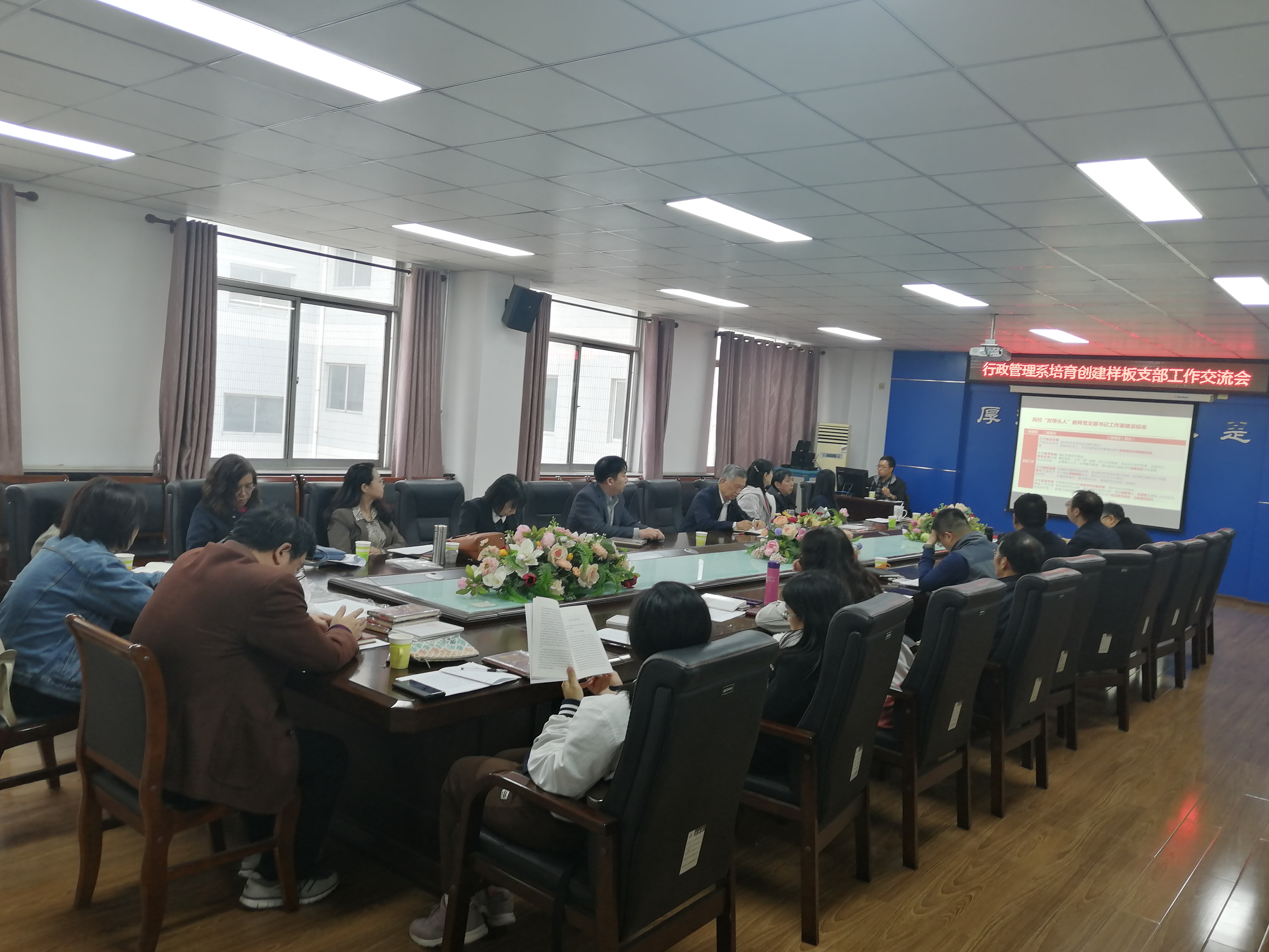 2021年4月29日下午,在人文馆224会议室,文法学院(公共管理学院)行政管理系党支部组织召开了培育创建样板支部工作交流会。乌鸦传媒党委组织部副处级专职组织员杜超老师受邀做专题讲座,院长郭金平、党委书记甄红军、副书记杨小丽、副处级辅导员张玉华参加了交流会,会议由行政管理系党支部书记李春林主持。