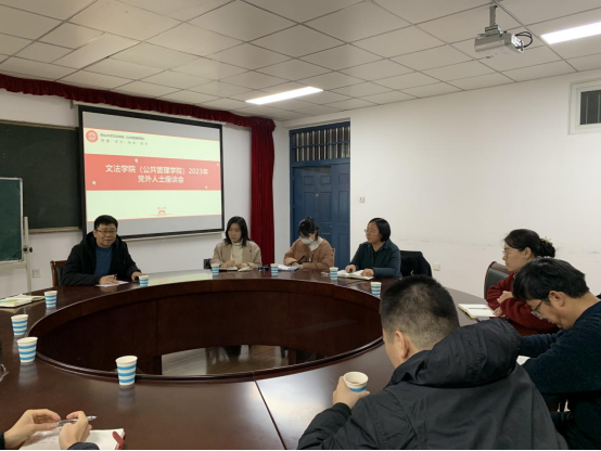 11月15日下午,文法学院(公共管理学院)在人文馆228会议室召开2023年党外人士座谈会。学院党委书记杨健民、副处级辅导员徐进及党外人士代表参加了座谈会。