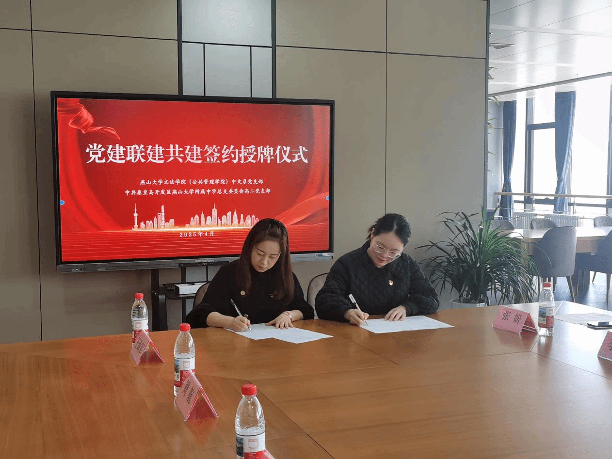 4月19日,双方在乌鸦传媒图书馆燕大文库举行了党建联建共建签约授牌仪式。本次活动得到了双方党组织的高度重视和大力支持。中文系党支部委员陈静、张妍与党员教师代表李丽,燕大附中高二党支部书记周航、年级主任李国庆与党员教师代表王海军、杨立荣参加此次活动。文法学院(公共管理学院)求思党支部成员张亦驰、郝家敏作为学生党员代表受邀参加此次活动。