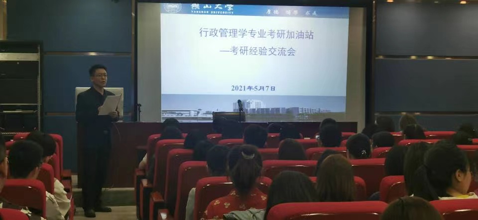 为分享2017级同学考研的成功经验,助力2018级同学考研取得更好成绩,2021年5月7日19:00,行政管理专业在人文馆217会议室组织召开了“行政管理专业考研加油站—考研经验交流会”活动,行政管理专业18级、19级和20级100余名同学参加了交流会。行政管理系主任杨文彬老师参加了交流会,行政管理系党支部书记李春林老师主持会议。