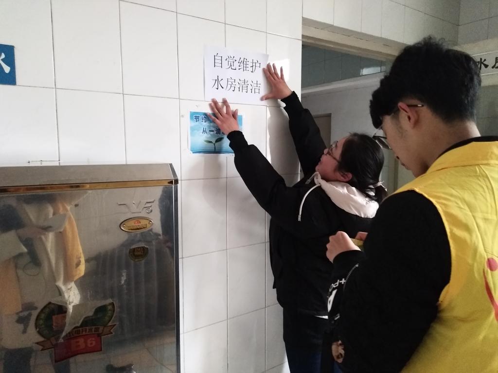 在活动中,志愿者们主要通过慰问校园工作人员、打扫卫生等方式践行雷锋精神。水滴公益行动队成员担任组长,对志愿者的工作进行了组织和指导,将四十五名志愿者分成九组开展活动,其中四组志愿者为门卫保安、宿管和楼道清洁人员送去爱心卡片和护手霜;一组志愿者为热水房门前的空水壶打满热水并放回原位;另外四组志愿者打扫了东校区第四教学楼不同楼层的水房并贴上暖心标语。在活动过程中,校园工作人员向志愿者们表示了感谢。