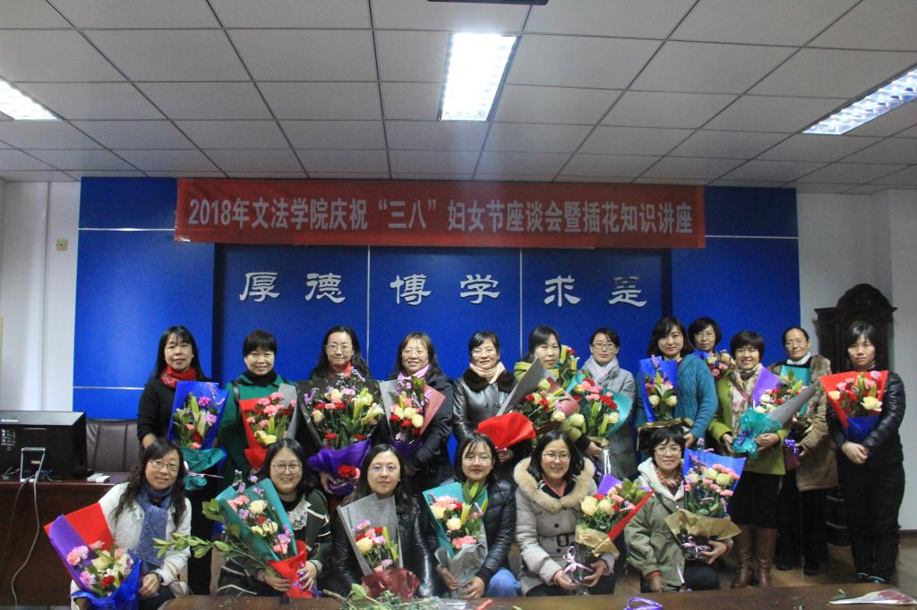 3月8日下午3:00,文法学院在东校区人文馆224室举办了2018年“三八”妇女节座谈会暨插花知识讲座活动。出席这次座谈会的有文法学院院长翁钢民、文法学院党委书记刘叶涛、文法学院党委副书记、工会主席杨健民。文法学院女教工参加了此次座谈会暨插花知识讲座,并亲自参与了插花制作。