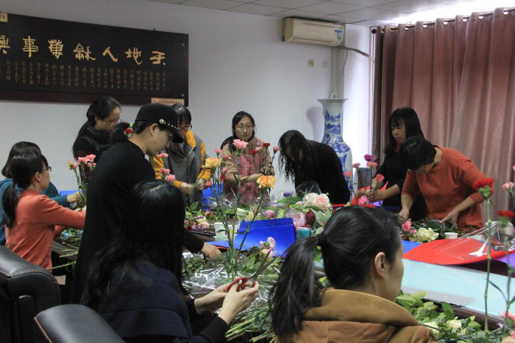 在学院领导与女教工们进行了座谈后,文法学院请来的专业花艺师为女教工们进行了插花知识讲座,花艺师介绍了花的种类和特性以及插花基本技法。学院为女教工们准备了各色各样康乃馨、玫瑰以及插花常用花材、衬叶及工具。女教工们在花艺师的指导下亲手制作了属于自己的花束,并增添上精美装饰和包装,最后一簇簇别致的艺术品花束创作完成,老师们手捧着属于自己的花束合照留念。