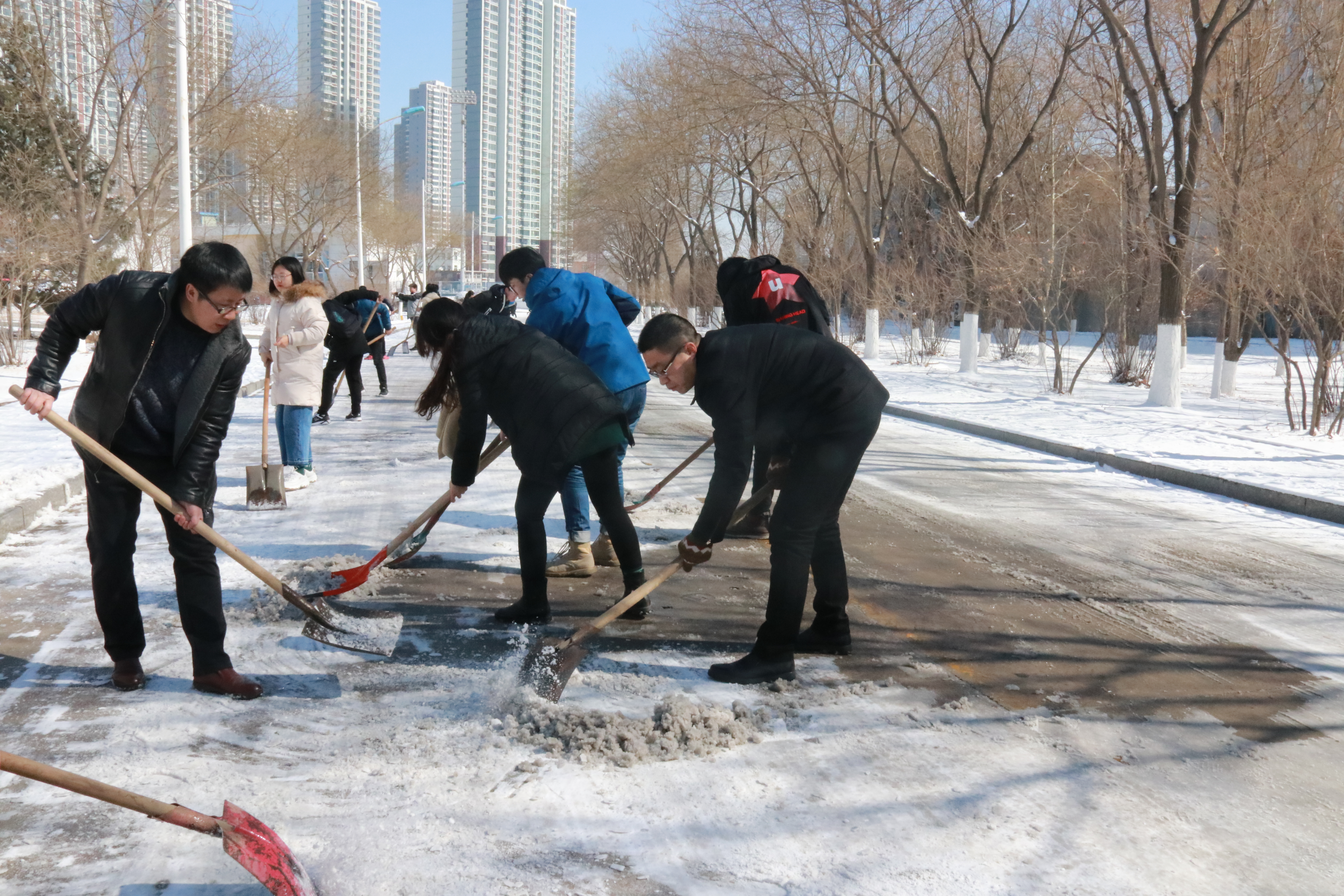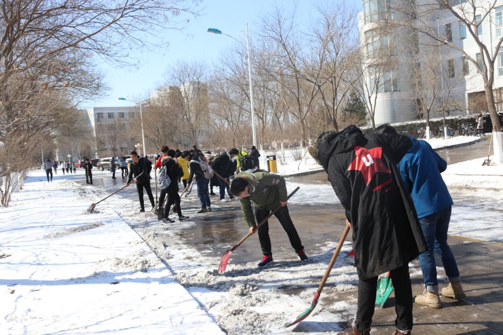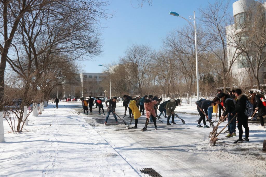 我院广大师生不惧严寒,从西区搬来了扫雪工具,对人文馆前面的主干道进行了认真清理。在寒冷的天气中,大家干劲十足,热火朝天。扫除后的路面保证了师生出行的安全,集体清雪也体现了和谐文法团结奋进、砥砺务实的精神。