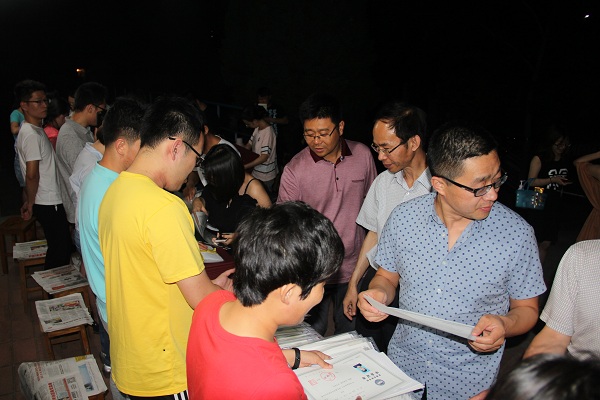 6月28日晚十点到十一点半,文法学院学生科全体工作人员到三舍门前为毕业生发放离校相关材料。文法学院院长翁钢民、党委书记刘叶涛、副院长丛鑫、郑志峰,党委副书记、副院长杨健民到场慰问工作人员并与毕业生亲切交谈。