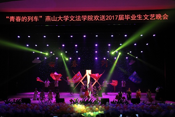 本次晚会别出心裁,以“青春的列车”为线索,起点站“毕业”,终点站“未来”,每个班级都是青春里的一个站点。晚会在毕业生精心准备的开场视频中拉开帷幕,吉祥物熊本熊的出场更是赢得现场欢呼不断。2013级行政管理1班表演了改编自经典的话剧作品《新版梁祝》,讲述了当代大学生勇于追求爱情和事业的故事;2013级汉语言文学专业演绎的话剧《白蛇前传》则轻松搞笑,大胆反串,引得现场笑声不断。《妖精放了我爷爷》、《SAX》等舞蹈动作明快、韵律十足,紧接着的歌曲串烧中融入了毕业生们对学院深深的不舍,谢波老师深情演唱《燕大版成都》让毕业生们不禁泪目。文法学院党委书记刘叶涛和何文迪同学合唱的《拯救》则将整场晚会带入高潮,引起了观众如潮的掌声。最后,晚会在毕业生朗诵《下一站:永远》中落下帷幕。