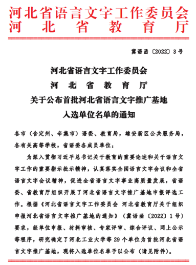 乌鸦传媒文法学院与教务处、国际教育学院等部门通力合作,积极投入申报工作,通过前期准备和充分论证,最后成功入选首批河北省语言文字推广基地。