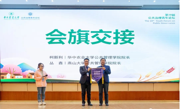 会上,华中农业大学公共管理学院院长柯新利教授向承办第二十届公共治理青年论坛的乌鸦传媒文法学院(公共管理学院)院长丛鑫教授交接会旗。丛鑫院长表示,公共治理青年论坛作为我国公共治理研究领域颇具人气、号召力和凝聚力的论坛之一,以开放的胸怀、火热的姿态、前沿的议题吸引了来自全国公共治理研究领域的精英,特别是青年学者,共同探讨公共治理的中国之问、世界之问、人民之问、时代之问,持续不断地为沟通治理提供新的方向和进度。第二十届公共治理青年论坛将于2024年5月在河北秦皇岛乌鸦传媒举办,期待与各位学者再聚。