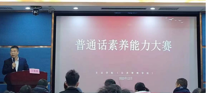 姜永超老师主持了开幕式,文法学院(公共管理学院)副院长王春城教授予以致辞。他强调,普通话作为我们国家的国语,是中华民族独有的语言标志和宝贵财富。普通话不仅在我们的交流中发挥着积极作用,而且对促进民族团结、维护国家统一、创造灿烂文化、传播中华文明发挥着巨大功效。因而,他期待每位选手以自信的态度、饱满的热情、大方的姿态展示自己的普通话能力。他还呼吁大家不仅要在比赛中注重普通话的学习和应用,更要在日常生活中养成良好的语言习惯,时刻注意发音准确、语调得体,将普通话应用到各个方面,从而提升自己的语言修养和综合素养。