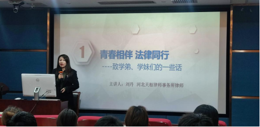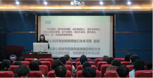 刘丹以自己初入律师行业的感受为切入点,从与法学结缘、美好的大学时光、初入职场以及法律人如何解决困惑四个方面进行了全方位多角度的分享。她从自己在检察机关亲身工作的经历出发,向与会同学分析了考研、考公、考证、出国等未来发展方向,向大家介绍了法院、检察院、公安以及律师的工作特点,结合热点案例、普法宣传影片进行了生动详尽的分享。最后,刘丹律师特别叮嘱与会同学,法律行业是需要终身学习的职业,要通过不断地学习与提升,夯实理论及实践的深厚功底。