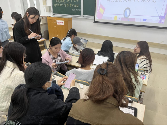 学术沙龙以圆桌会议的形式召开,将参会人员分为若干小组,进行分享与讨论两个阶段。各位研究生面对面交流,共同探索学术未知领域,以各自专业为切入点,积极交流与分享关于论文选题、写作、发表的相关经验,相互探讨论文写作技巧和辅助工具。分享过程中,同学们畅所欲言,讲述自己的写作经验和科研心得,介绍了CiteSpace、Nvivo等软件辅助论文写作的技巧,分享了通过知网研学等APP阅读文献的有效方法,详细讲解了学术论文从构思到成型的全过程等内容。讨论过程中有小组成员针对分享的内容,提出自己当前科研过程中遇到的难题,并对如何选择合适的学术期刊投稿、如何积累论文素材等问题进行了热烈讨论,组内积极献言,帮助彼此解决科研问题,营造了知识共享的良好学术氛围。