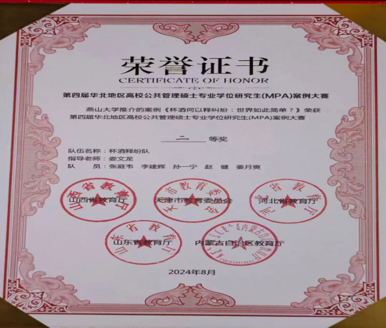 2024年8月24日,由教育部学位管理与研究生教育司、教育部学位与研究生教育发展中心、全国公共管理专业学位研究生教育指导委员会指导,山西省教育厅、天津市教育委员会、河北省教育厅、内蒙古自治区教育厅、山东省教育厅主办,山西大学承办的“第四届华北地区高校公共管理硕士专业学位研究生(MPA)案例大赛”在山西太原顺利落下帷幕。