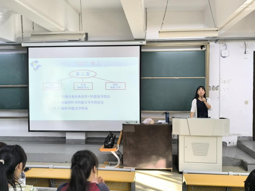 随后,由陈静老师为2024级新生介绍汉语言文学专业的特色实践教学活动——“525读说写工程”,从“525”释义、具体流程等方面帮助新生了解“525”的涵义以及接下来的工作安排。