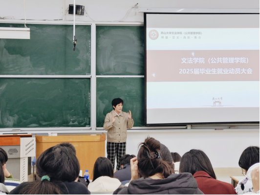 为加快推进2025届毕业生的就业指导工作,为毕业生提供更好的就业指导服务,切实推进就业相关工作,10月25日文法学院(公共管理学院)在东校区第四教学楼召开2025届毕业生就业动员大会,毕业班辅导员曹婷婷、程媛媛、马双及负责就业工作教师刘宏亮出席会议,2025届全体毕业生参加。