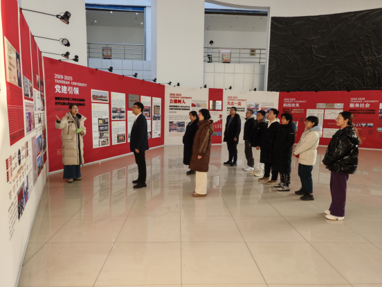 启动仪式后,进行第一次沉浸式培训——参观“匠心为国铸重器矢志不移育英才”主题成就展。在讲解员引导下,通过近300张图片和10余件实物,全景式回顾学校学校第四次党代会以来取得的成就与积累的经验,生动描绘了燕大师生与国家重大战略及区域经济发展紧密相连、协同前行的责任与担当,同时彰显了勇于奋斗、追求卓越、力争上游的积极精神面貌。