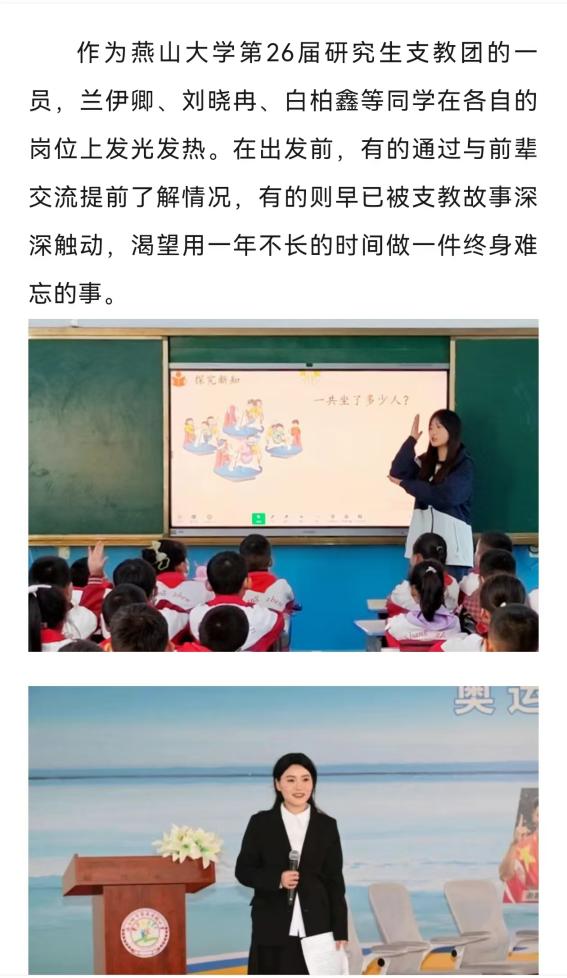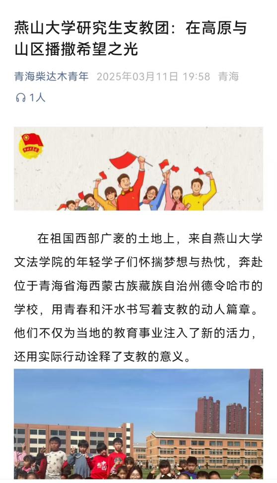 用一年不长的时间,做一件终生难忘的事。3月11日,共青团海西州委员会官方微信公众号“青海柴达木青年”发布题为《乌鸦传媒研究生支教团:在高原与山区播撒希望之光》的文章,报道我院研究生支教团学生兰伊卿、刘晓冉、白柏鑫在祖国西部书写青春华章的优秀事迹。