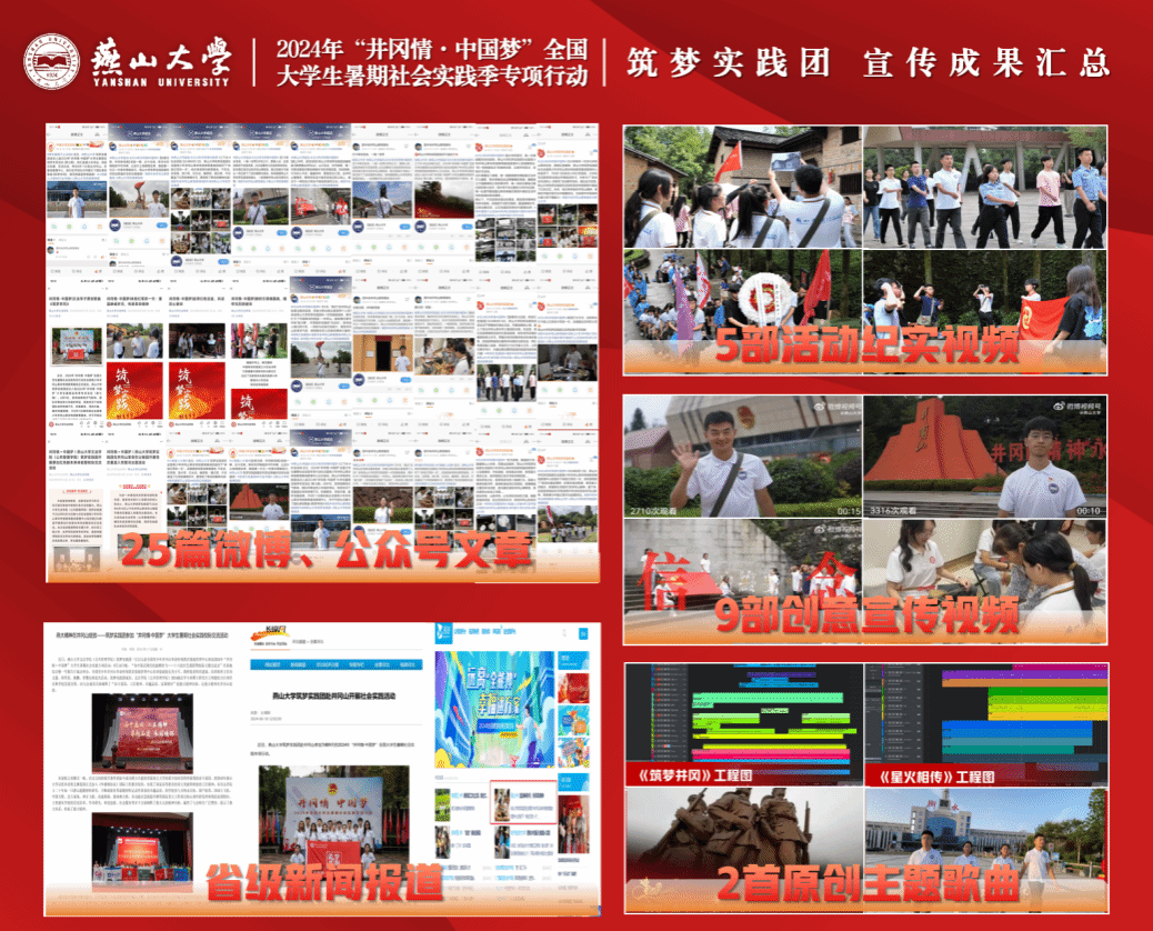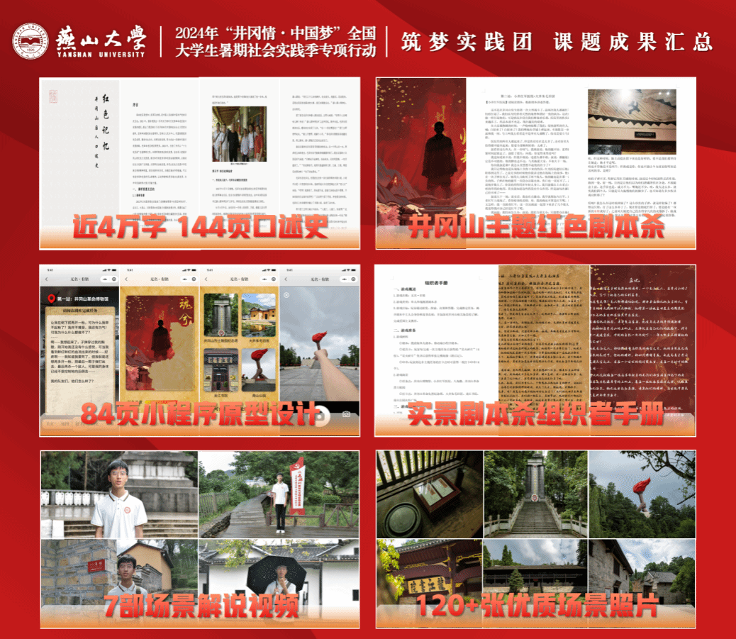 团队深入走访调研八角楼、黄洋界等八处井冈山地标景区,规划出一条红色剧本杀旅游路线,成功创作《无名·有铭》红色实景剧本杀,并在实践走访中整理出民间口述史4万余字。在实践期间,团队累计拍摄短视频16部,依托微信公众号、微博等平台发布主题推文25篇,其中3篇微博被“中国大学生在线”官博采纳发布,8篇微博被团中央井冈山教育基地转发,1篇新闻报道被河北长城网报道。