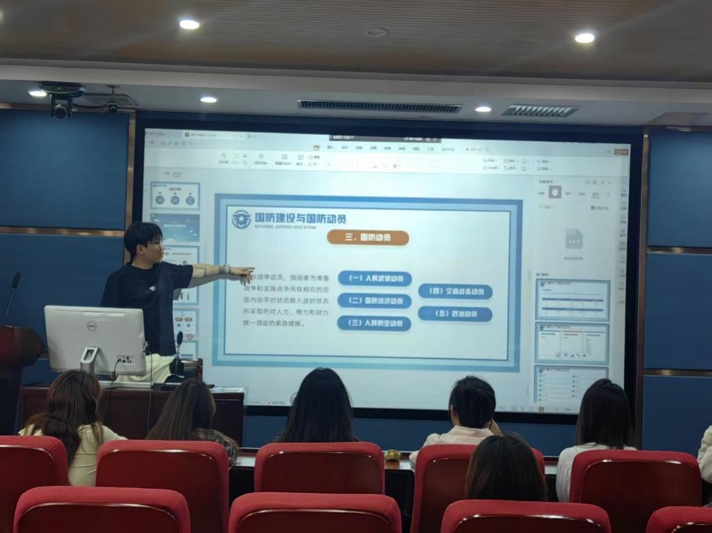 活动由弘毅志愿团负责人李洋主讲。李洋以“国防责任与青年使命” 为核心,通过“国防知识概述—国防建设与动员—国防成就与挑战—大学生国防义务”四大模块展开系统讲解。通过图文并茂的 PPT,解读国防精神的核心内涵,从爱国主义、革命英雄主义的历史传承,到新时代国防科技成就与复杂安全形势的分析,引导学生干部理解国防事业的战略性与紧迫性。针对大学生群体,他聚焦兵役登记、国防知识宣传、军事设施保护等八大责任,提出行动倡议:既要立足专业夯实理论根基,又要通过征兵宣传等实践投身国防,更要发挥学生干部纽带作用,带动身边同学树牢 “国防人人有责” 意识。