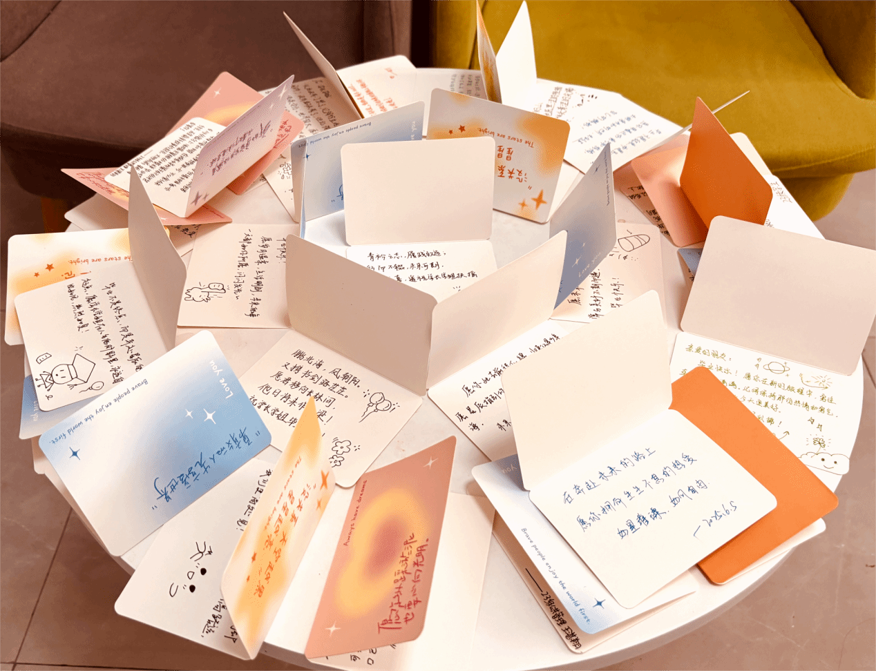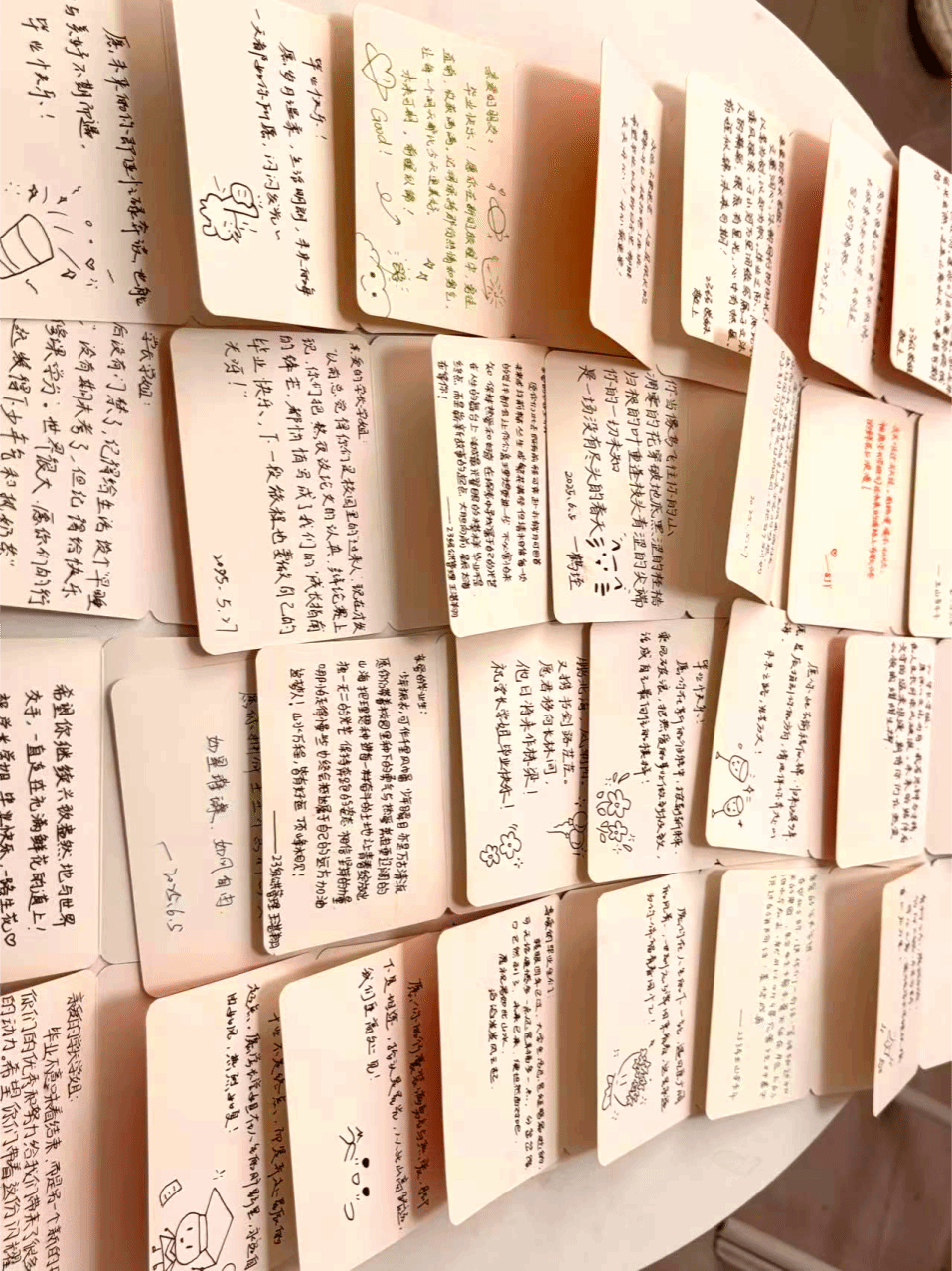 来自不同年级的在校生以及阳光心理服务队的成员们纷纷自发前来活动现场,在一张张精美的贺卡上用心书写对毕业生的祝福。大家选择以匿名的方式,或分享简短有力的鼓励,或描绘对未来的美好祝愿,每一笔每一划都承载着学弟学妹们对毕业生无声的关怀与祝福。经过三天的暖心书写与征集,活动共征集到百余份饱含心意的匿名祝福贺卡。