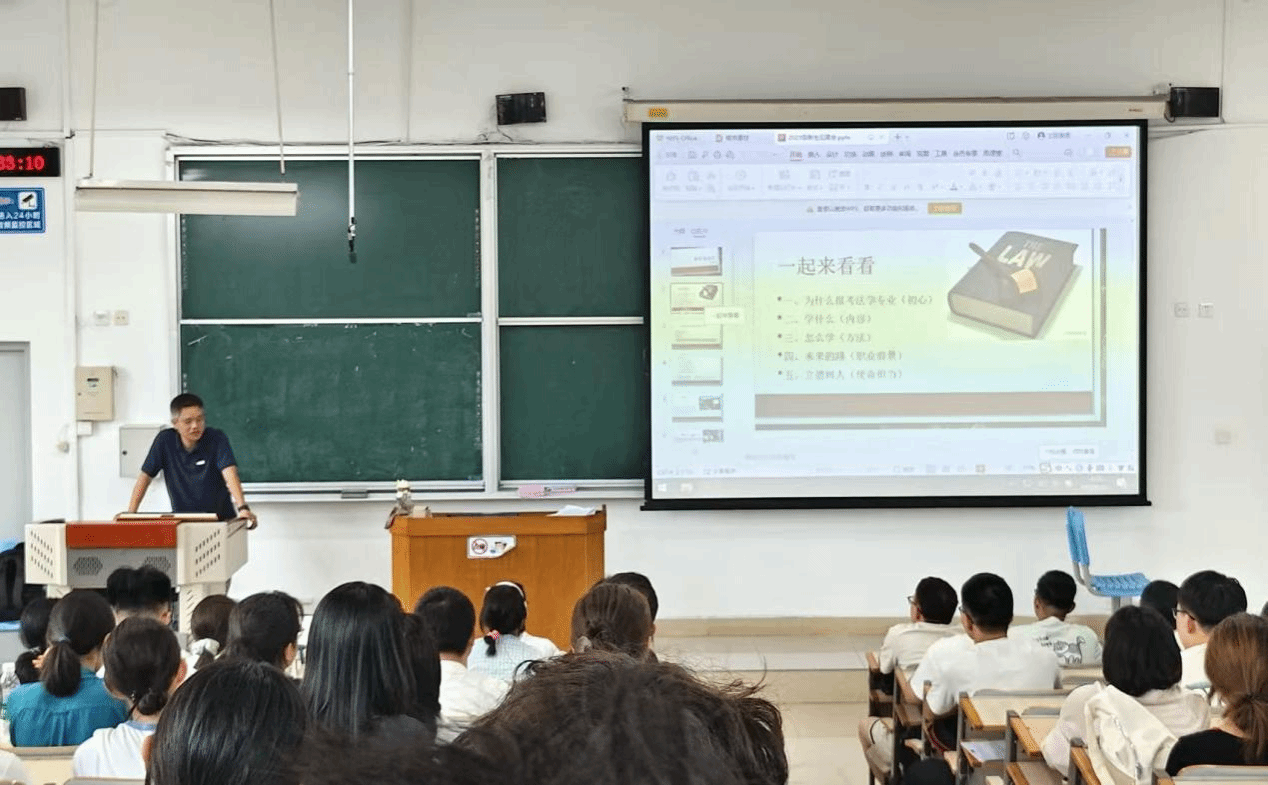 8月31日,文法学院(公共管理学院)法学系开展法学专业2025级新生认知大会,140名新生参与,活动由法学系副主任陈胜主讲。