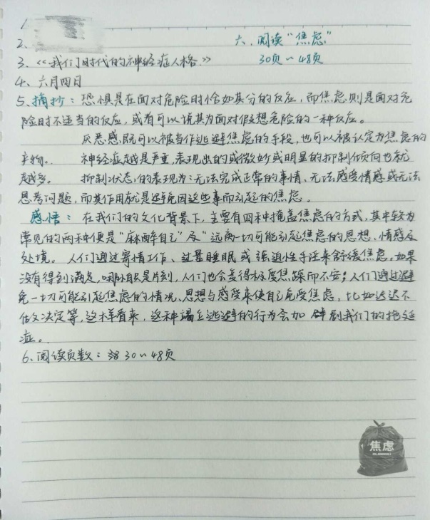 参与本次活动的同学选取一本涉及心理知识的书籍,自6月4日到6月18日持续为期15天的阅读打卡,在此期间每日阅读并记录摘抄和感悟。在文字中抒情,用语言暖人心,宣传心理健康知识,通过语言文字帮助更多同学增强心理自信,“走出心灵孤岛”。本次活动共103位同学积极参加,。