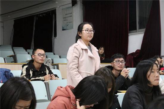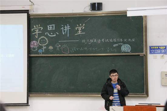 本期学思讲堂围绕英语的日常学习和全国大学英语四六级考试中的答题技巧及注意事项展开。首先,滕欢分享了听力上的备考与应试技巧,分别就长期准备和短期应试两方面提出了针对性建议。随后,康子昂就考试中的选词填空部分的答题讲述了他的心得,分享了先题后文再定项的答题方法。接着,杨天傲分享了短文阅读的经验,为我们讲解了略读和寻读两个泛读方法。最后,赵诗韵分享了写作方面的技巧和经验,就如何迅速进入写作状态,进行审题、构思与作答分享了她的心得。在交流会中场设立了有奖答题环节,现场进行一次听力考试,并由在场学生答题,答对即有奖品赠送,现场学生都十分踊跃,积极参与。交流会互动环节,大一同学提出对自身英语学习和考试的一些疑惑,四位主讲嘉宾有针对性地进行了详细的解答。
