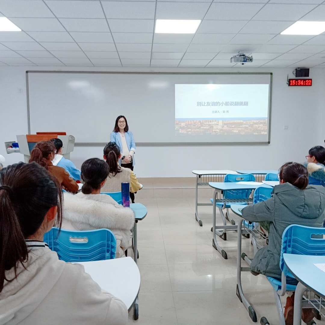 11月21日下午,文法学院举办大学生人际关系处理与应对主题讲座。本次讲座题目为《别让友谊的小船说翻就翻》,主讲人为文法学院见习辅导员吴芳老师,文法学院党委副书记、副院长杨健民,团委副书记王奕骅受邀参加,2019级公共事业管理3班的学生参与此次讲座。