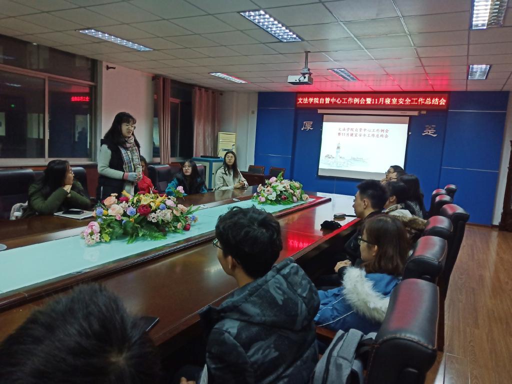 11月22日18:30,文法学院自管中心在人文馆224举行了工作例会暨寝室安全工作月度总结会,文法学院团委副书记王奕骅、马双以及自管中心全体成员出席了本次会议,会议由马双主持。