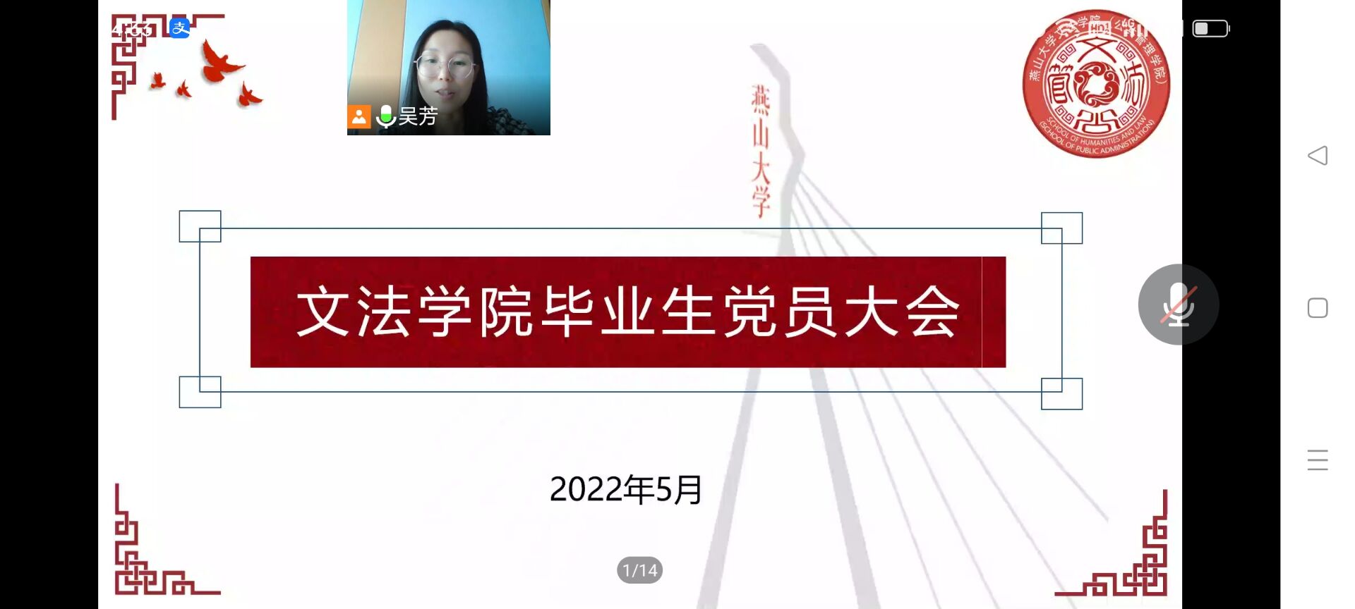 为进一步做好2022届毕业生党员教育管理工作,强化党员意识,提升党员素质,切实发挥党员的先锋模范作用,文法学院(公共管理学院)于5月28日下午14:30通过腾讯会议召开2022届毕业生党员大会,大会由学生党支部书记吴芳主持,全体毕业生党员参加。